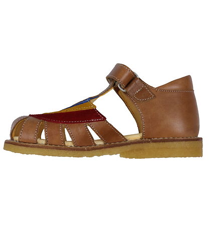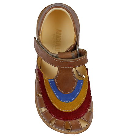 Süße Angulus Sandalen aus braunem Leder mit einem Schöne Regenbogen am Vorderfuß aus blauem, gelbem und rot Wildleder.