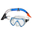 Das Schöne BECO Schnorchelset enthält eine Schwimmmaske und einen Schnorchel. Schwimmmaske in transparent mit blauem Rand um das Glas, und der Schnorchel ist ebenfalls in blau mit transparenten Teile.