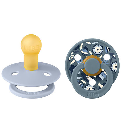 Wunderschöne BIBS x Liberty Schnuller, verkauft im praktischen 2er-Pack in Mattes Hellblau und matt Dunkelblau mit feinem Print in Nuancen.