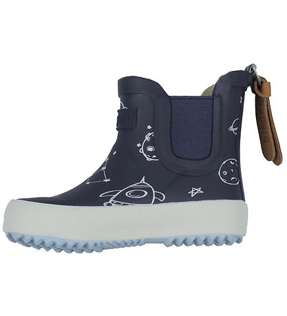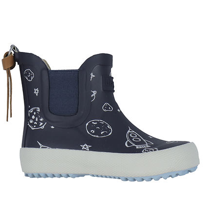 Feine Bisgaard Gummistiefel in Marineblau mit leuchtendem Weltraum-Print. Auf der Vorderseite befindet sich ein geprägtes Logo.