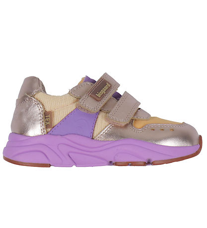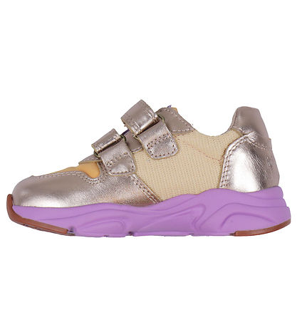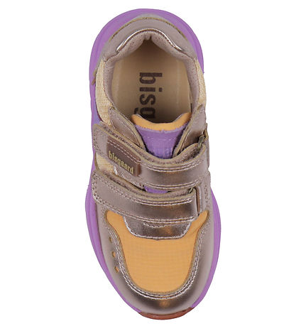 Elegante Bisgaard Schuhe aus glänzemdem goldenen Leder und orangefarbenem Textil mit lila Laufsohlen.