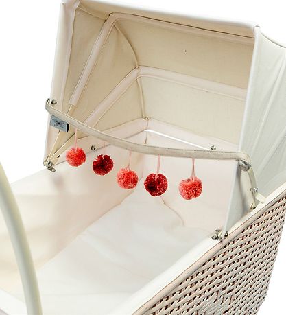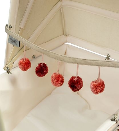 Smart by ASTRUP Kinderwagenkette, bestehend aus einem Weiß Band mit fünf Pompons in Nuancen und Rottönen.