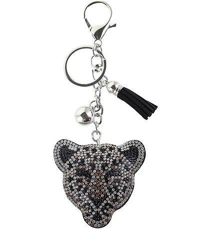 Smart By Stær Schlüsselanhänger in Form eines Leopardenkopfes in Schwarz mit kleinen Glitzerstein in Schwarz, Silber und Braun. Der Schlüsselanhänger ist aus silbernem Metall mit einem runden Anhänger und einem Anhänger mit schwarzen Fransen. Der Schlüsselanhänger lässt sich einfach an einer Tasche Fast und mit Ihren Schlüsseln mitnehmen.
