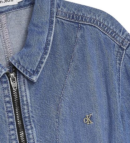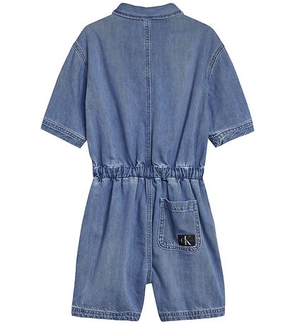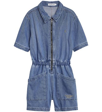 Wunderschöner Jumpsuit von Calvin Klein in schlichtem in Blaudenim. Vorne auf der linken Brust, auf der linken Tasche und auf der rechten Tasche auf der Rückseite befindet sich ein Logo des Markennamens.