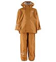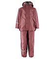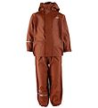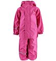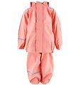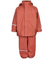 Niedliche CeLaVi Regenkleidung bestehend aus einer Regenjacke und einer Regenhose in schlichtem Korallen- PU. Um den rechten Arm und das rechte Bein verfügt die Regenkleidung über einen praktischen Reflexstreifen, während oben an der Kapuze sowie auf der linken Brust und am rechten Bein das CeLaVis-Logo im Reflexdruck aufgedruckt ist.