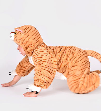 Lebensechtes Den Goda Fen Kostüm, das eine orangefarbene, gestreifte Katze mit Kopf, Schwanz und Krallen darstellt.