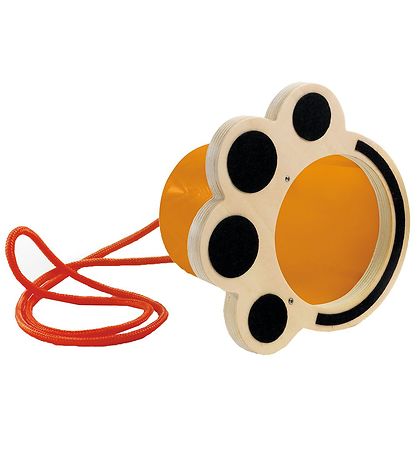 Lustige Djeco -Laufeimer in Gelb mit feinem Muster und Holz darunter, das Krallen darstellt.