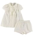 Das Emporio Armani Kleid hat kurze Ärmel mit schmalen Gummikanten. In der Taille hat es einen breiten Gummizug mit schönen Rüschen, und unten flacht der Rock mit einer guten Weite ab. Das Kleid wird am Hals mit einem klein Knopf geöffnet. Im Körper und im Rock befindet sich innen eine zusätzliche Lage aus weißer Baumwolle in leichter, fest gewebter Qualität.