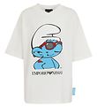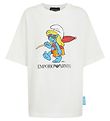 Smart T-Shirt von Emporio Armani in Weiß. Auf der Vorderseite befindet sich ein großer Print mit starkem Schlumpf und roter Sonnenbrille.