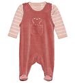 Ansprechender Fixoni Strampler und Body. Der Strampler ist hellbraun und aus Velours, auf der Vorderseite ist ein hellbraunes Kaninchen gestricktem. Der Body ist weiß mit schmalen, horizontalen Streifen in Hellbraun.