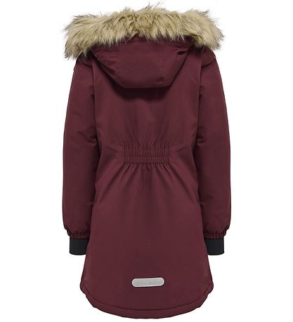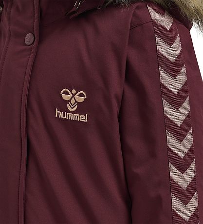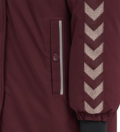 Schön Hummel Winterjacke in Burgund mit der klassischen Hummel gestricktem auf der linken Brust und den charakteristischen abgewinkelten Bändern An der jedem Ärmel in Rosègold Roségold.