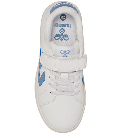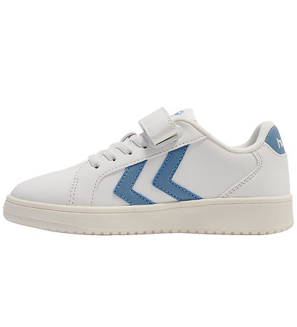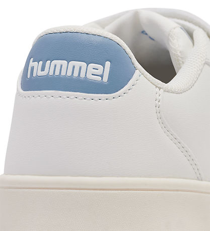 Stilvolle Hummel Schuhe in Weiß mit den klassischen Hummel Winkeln in Mattblau an der Seite und einer mattblau Ferse. Perfekt für einen modernen und aktiven Look.