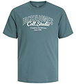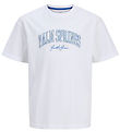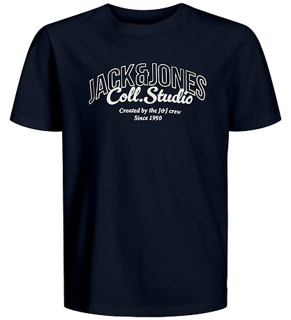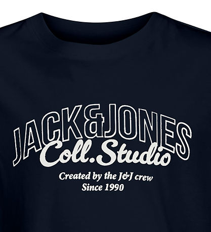 Das T-Shirt hat einen Rund mit gerippter Rand. Auf der Vorderseite befindet sich ein klarer Weiß Print mit dem Text „Jack & Jones Coll. Studio“ sowie zusätzlichen Details wie „Created by the J&J crew“ und „Since 1990“.