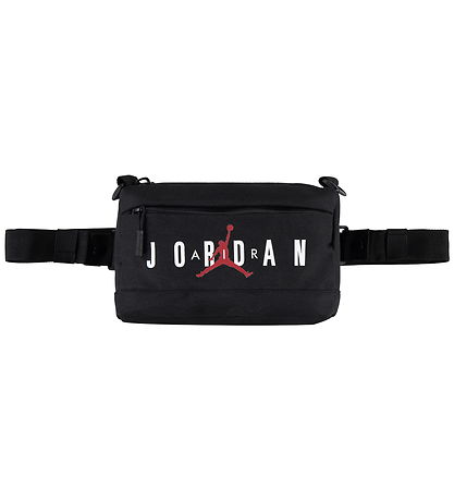 Schön Jordan Umhängetasche in Schwarz, mit einem Logoaufdruck in Weiß und rot auf der Vorderseite.