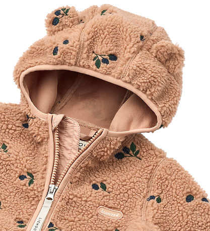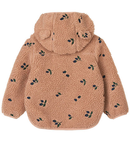Schöne Liewood Fleecejacke aus rosa Teddyfleece mit kleinen, aufgestickten Beeren, die über die gesamte Oberfläche verstreut sind.