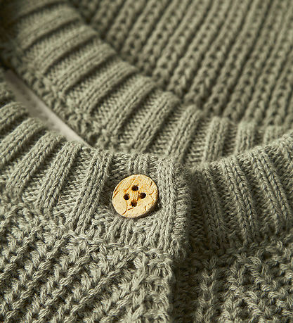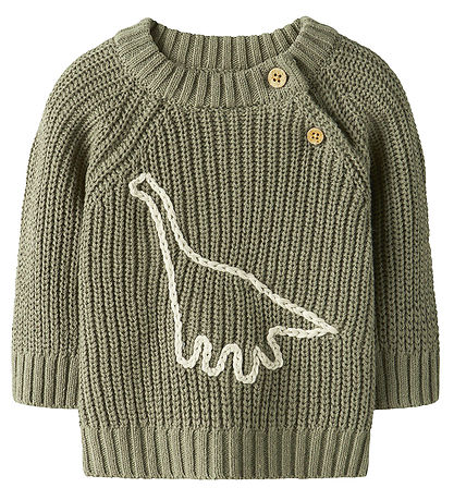 Schöne Lil' Atelier Bluse mit Rippenstruktur in Mattgrün mit einem weißen dinosaur auf der Vorderseite. Die Bluse hat einen Rund Ausschnitt mit zwei Zugknöpfen an der linken Schulter. Sie hat lange Ärmel mit breiten Gerippte Kanten an allen Öffnungen der Bluse.