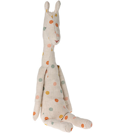 Niedlicher Maileg Kuscheltier in Giraffenform in Cremeweiß mit farbigen Punkte.