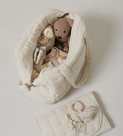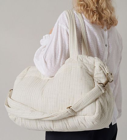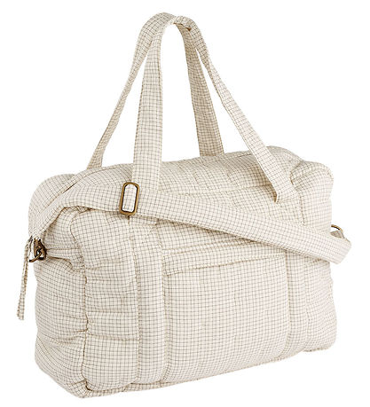 Schön Wickeltasche von MarMar in Weiß mit Karomuster in Navy und weich wattiert.