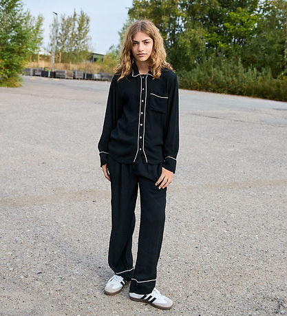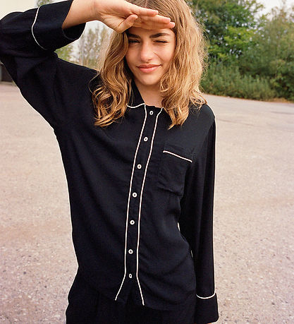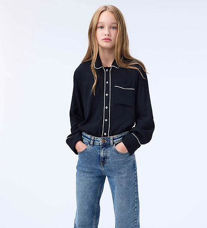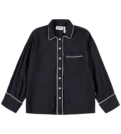 Elegantes Molo Hemd mit langen Ärmeln in Schwarz. Das Hemd hat weiße Kantendetails an Kragen, Ärmeln und Knopfleiste. Das Molo Hemd hat ein klassisches Design mit einer Brusttasche, ebenfalls mit weißem Rand.