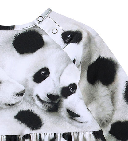 Einladendes Molo Kleid mit einzigartigem Panda- Print in Schwarz und Weiß. Das Molo Kleid hat lange Ärmel und einen weiten Rock. Das Kleid wird mit Druckknöpfen hinter der rechten Schulter geöffnet.