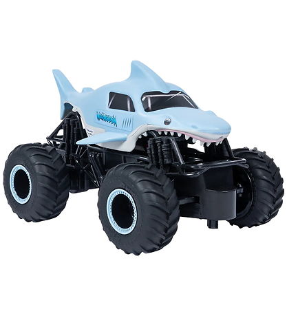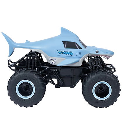 Cooles ferngesteuertes Monster Jam Auto in Form eines Megalodons in Hellblau und Schwarz. Das Auto hat robuste, schwarze Räder, die für ein authentisches Fahrgefühl sorgen. Das Auto kann vorwärts, rückwärts und nach links und rechts abbiegen. Gesteuert wird das Auto mit einer schwarzen Fernbedienung.