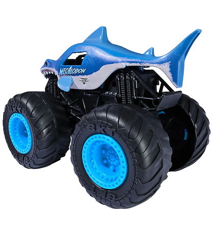 Aufregendes Monster Jam Auto in auffälliger blauer Farbe mit beeindruckendem Megalodon- Print. Das Monster Jam Auto hat robuste schwarze Reifen mit blauen Details, die einen coolen Look zum Spielen und Sammeln verleihen. Darüber hinaus verfügt das Auto über coole Sound- und Lichteffekte.