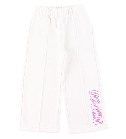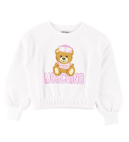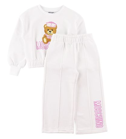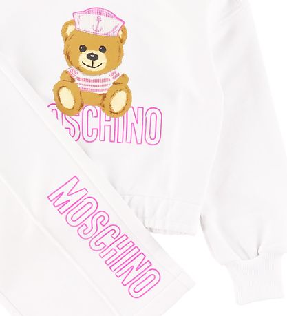 Süßes Moschino Sweatset, bestehend aus einem Sweatshirt und einer Jogginghosen in Weiß. Auf der Vorderseite des Sweatshirt befindet sich ein Logo-Print mit einem braunen Kuscheltier, der mit Nähten und Pailletten in Weiß und pink verziert ist, und darunter steht"Moschino" in pink Buchstaben gedruckt. Unten am linken Hosenbein ist "Moschino" in Pink aufgedruckt.