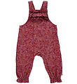 Köstliche Müsli Latzhosen mit einem wunderschönen Allover-Blumendruck in den Farben Dunkelrot, lila, Braun und Orange.