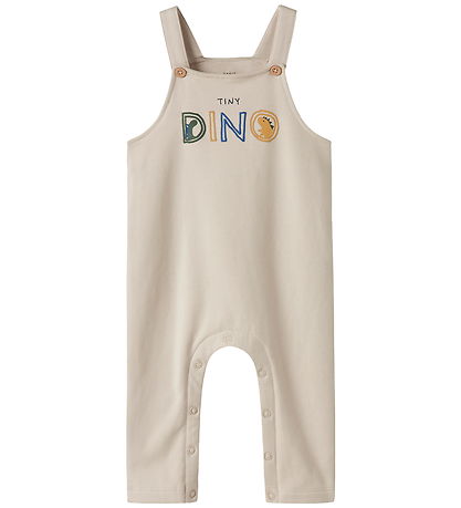 Tolle Name It Latzhosen in Beige mit einem Print auf der Vorderseite mit dem Text „Tiny Dino“ in Schwarz, Grün, Gelb und Blau.