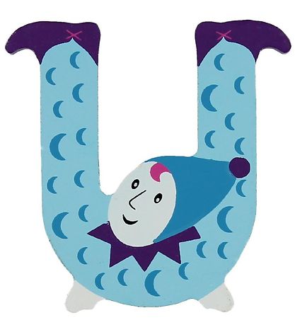 Lustiger Petit Jour Paris Buchstabe U in hellblauer Elfenform mit blauem Hut und lila Schuhen und mit pink Details.