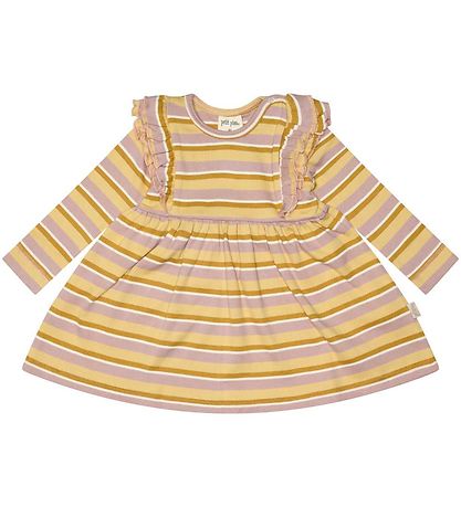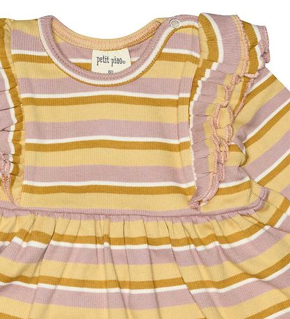 Schön Petit Piao Kleid mit Streifen in Rosa-, Weiß- und Nuancen in guter Rippenstruktur. An den seiten der Brust befinden sich auf jeder Seite zwei breite Rüschen.