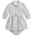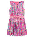Das Polo Ralph Lauren hat kurze Ärmel und am Ausschnitt befindet sich ein schön Kragen mit abgerundeten Ecken aus dicht gewebter Baumwollqualität. In der Taille hat das Kleid einen schmalen Gummizug und der Rock fällt unten mit einer guten Weite. Das Kleid wird am Hals mit kleinen, navy, stoffbezogenen Knöpfe geöffnet und ist aus einer starken, dehnbar Qualität gefertigt.