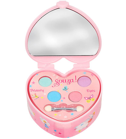 Wunderschöne Souza Lidschatten werden in einer rosa Herzbox verkauft, in der sich vier Lidschatten in Pink, lila, minzgrün und Hellblau sowie ein praktischer Lidschattenpinsel und ein Spiegel befinden.