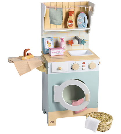Die Tender Leaf Waschmaschine hat alles, was man zum Aussortieren der schmutzigen Puppenkleidung braucht. Es gibt eine Vaskemaskine mit zu öffnender Tür und einer Schubladen für Waschpulver. Darüber befindet sich ein Waschbecken und ganz oben sind Wäscheleinen für nasse Kleidung angebracht. Wenn die Kleidung trocken ist, kann sie schön auf dem Klapptisch an der Seite gebügelt werden. Die Waschmaschine hat viele Knöpfe, die man drehen und drücken kann, und es ist inbegriffen, wie Klammern, ein Wäschekorb aus Weide und verschiedene Flaschen und Kisten aus Holz und Pappe.