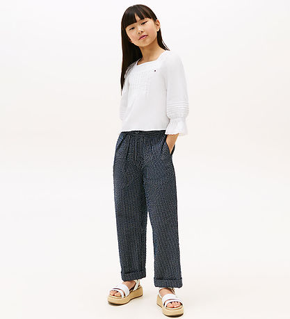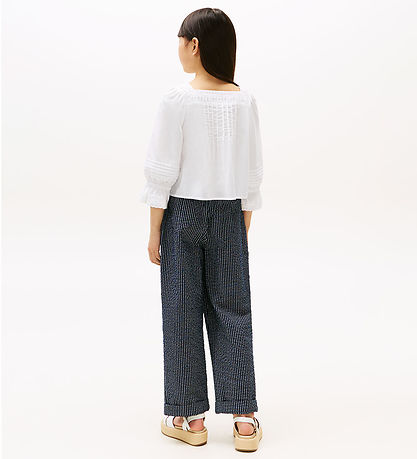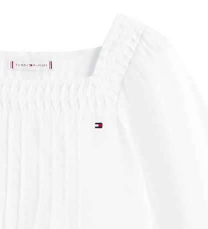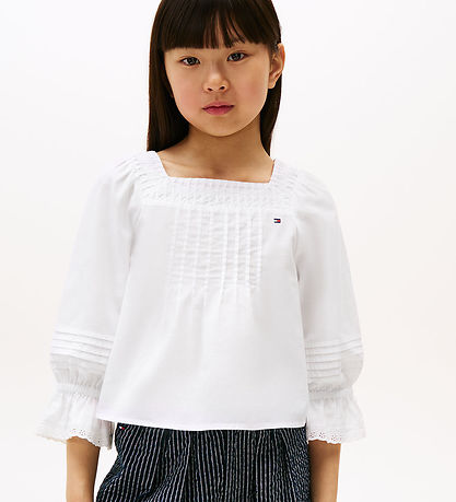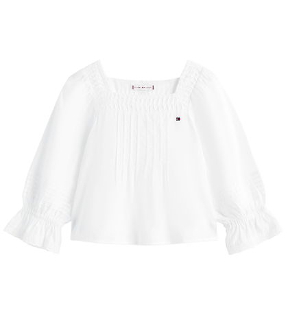 Elegante Tommy Hilfiger Bluse in Weiß mit feinen Details. Das Tommy Hilfiger Hemd hat einen quadratischen Ausschnitt und lange Ärmel, die mit Rüschen und Spitze versehen sind. Das Hemd hat vorne kleine Falten, die ihm einen raffinierten Look verleihen.