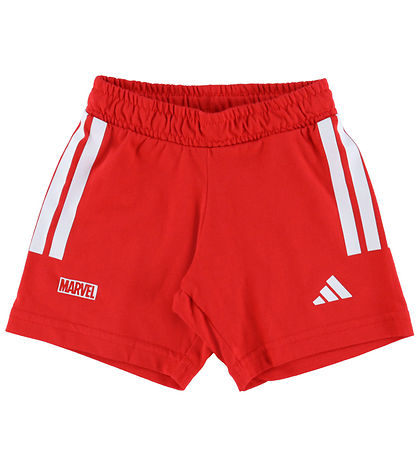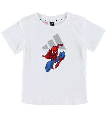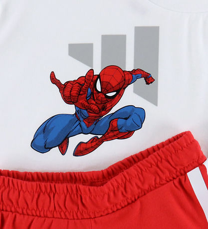 Schön adidas Performance Shorts Set bestehend aus einem T-Shirt und einer Shorts. Das T-Shirt ist weiß mit einem großen, schwarzen Logo- und Spider-Man Print auf dem Bauch. Die Shorts sind rot mit einem Weiß Logo-Print auf dem linken Oberschenkel.
