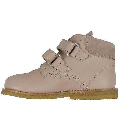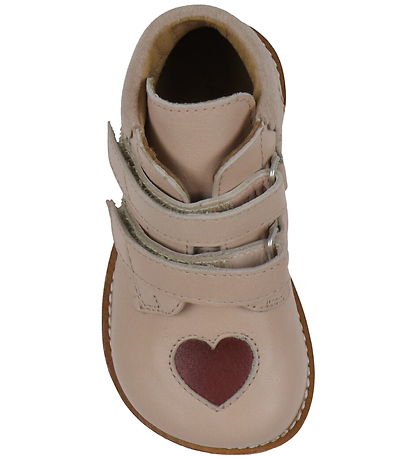 Bezaubernde Angulus -Stiefel in Pink mit einem roten Herz auf dem Top und feinen Nahtdetails. Die Angulus Stiefel werden mit Klettverschlüssen am Knöchel geschlossen. Sie haben verstärkte Ferse- und Zehenkappen und sind innen aus braunem Leder gefertigt. Die Stiefel haben eine leichte und flexible Laufsohle mit einem Rüschenmuster an der Unterseite, das für guten Halt sorgt.