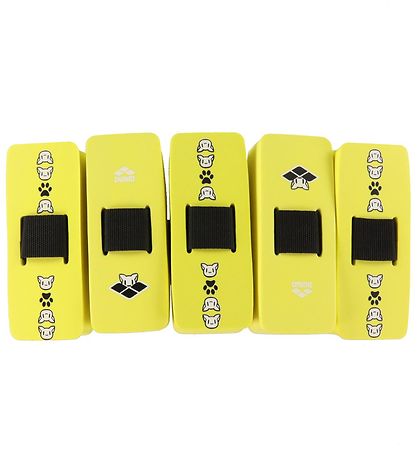 Süßer Arena Friends Schwimmgürtel bestehend aus 5 gelben Blöcken mit einem Print der Arena Friends Katzen und dem Logo in Schwarz-Weiß.