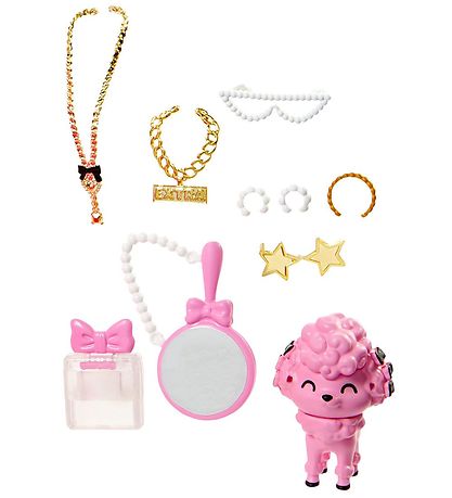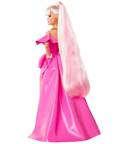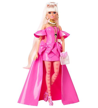 Schön Barbie -Puppe, die ein wunderschönes rosa Kleid mit feinen Details trägt. Die Puppe trägt rosa Strumpfhosen und rosa Stilettos. Die Barbie Puppe hat lange blonde Haare mit Pony. Inbegriffen. Die Barbie - Puppe hat einen rosa Hund unter dem Arm, der eine goldene Sonnenbrille trägt.