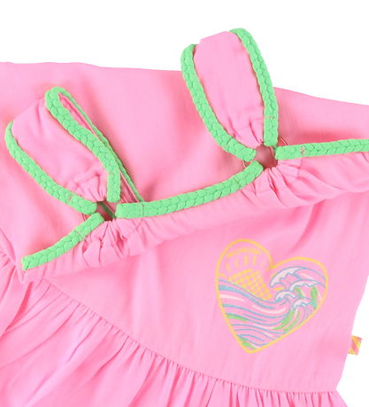 Schön Billieblush- Kleid in Rosa mit grünen, geflochtenen Rändern und einem Print auf der linken Seite einer Welle und Sonne in einem Herzen in Gelb-, Weiß-, Blau- und Nuancen und Glitzerdetails.