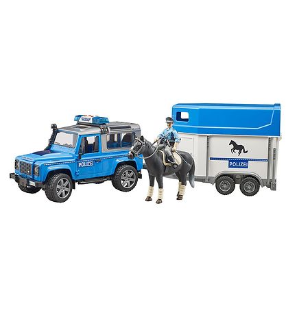 Schön Bruder Auto in Form eines Land Rover Polizeiauto mit Licht und Sound und einem Pferdeanhänger sowie einem Polizisten mit Pferd und Zubehör. Das Auto ist in einem blauen Farbthema gehalten und erscheint im Maßstab 1:16 absolut originalgetreu.