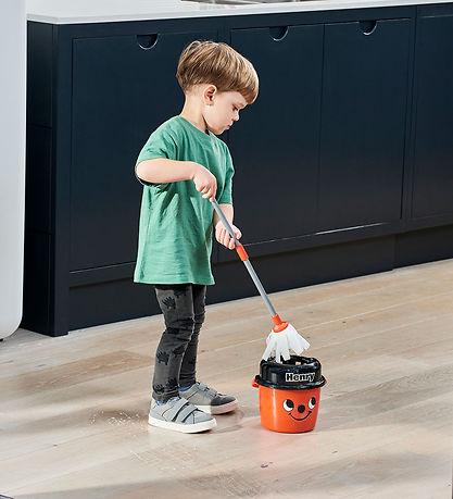 Lustiger Casdon Bodenwischer und Eimer in Form des süße, roten Eimers Henry mit seinem Bodenwischer, der Kinder dazu inspiriert, bei der Hausarbeit zu helfen.