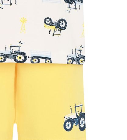 Coole CeLaVi Schlafanzug bestehend aus einem in Elfenbein T-Shirt mit Allover-Print aus gelben und hellblauen Traktoren. Die Shorts sind gelb mit einem großen Traktordruck auf der linken Seite.