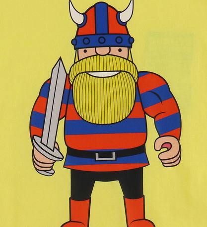 Cooles Danefæ T-Shirt in Gelb mit Print auf der Vorderseite von Erik in Blau und rot mit einem Schwert und Print auf der Rückseite von Erik.