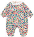 Der Velours Strampler ist rot, pink, blau und marineblau gestreift - mit einem weißen Kontrast-Reißverschluss vorn.