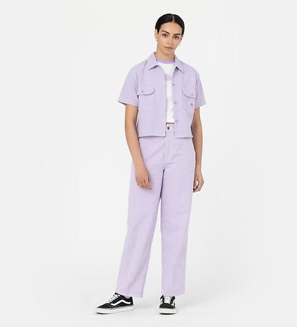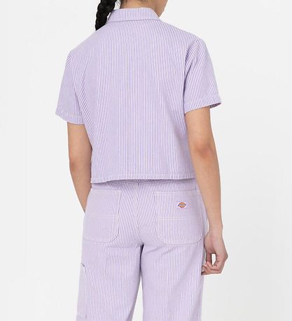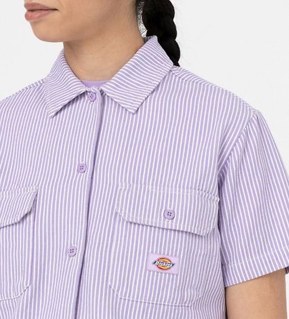 Schön Dickies Hemd in Lila mit weißen, vertikalen Nadelstreifen. Vorne auf der linken Brusttasche befindet sich eine Logoapplikation.