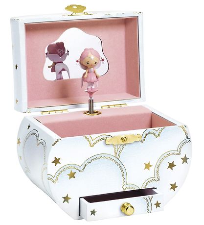 Wunderschönes Djeco Schmuckkästchen in Weiß, mit Print und Sternen in Gold. Auf der Vorder- und Rückseite des Schmuckkästchens befindet sich ein Print der Tänzerin der Spieluhr.