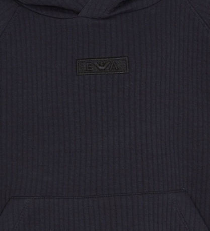 Schön Emporio Armani Kapuzenpullover in Navy mit dezenter gesteppt und vertikalen Verbindungsstücken. Der Kapuzenpullover hat ein stilvolles, gestricktem Logo auf der Brust. Der Emporio Armani Kapuzenpullover hat eine klassische, geräumige Kängurutasche und weiche Gerippte Kanten an Taille und Ärmeln für eine gute Passform. Der Kapuzenpullover besteht aus weichem Baumwolljersey.