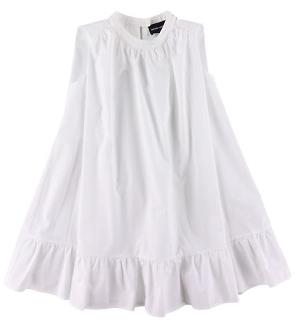 Das Kleid von Emporio Armani ist ganz ohne Ärmel und hat eine lockere Passform mit viel Platz. An den Schultern und am Ausschnitt befinden sich feine Rüschendetails und unten hat das Kleid eine breite Rüsche. Das Kleid wird am Hals mit einem Knopf geöffnet.