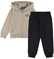 Schöner Emporio Armani Sweatset, bestehend aus einem Kapuzenpullover und einer Jogginghosen in Schwarz mit Details an den Rippkanten mit schmalen, weißen Streifen und dem Namen "Emporio Armani".